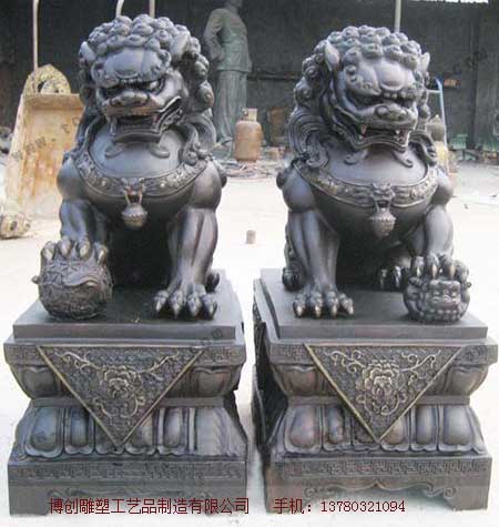 獅子原產于亞洲西部和非洲,漢代作為貢品傳入中國。當時獅子類珍稀動物都養在帝王宮苑內,平常百姓難以看到。獅子的傳入動搖了傳說中虎的威信,漸被人們視為辟邪瑞獸。加之佛教對獅子大為推崇,因此獅子也隨著佛教扎根于民間。并被視作"百獸之王",壓邪安吉的象征。以前建造的廟宇,一般將雄獅擺放在左邊,雌獅擺放在右邊,這主要是受到傳統觀念"左邊為大位,右為小"和"男尊女卑"的影響,所以有"男左女右"之說。現在許多銀行的門口都有許多擺放的匯豐獅,象征著招財。但新建的廟宇,則漸漸不受傳統廟宇建筑觀念影響,如果你看到的獅子不是在正門兩側,比如座落在廣場前,則純是裝飾取象征意義而已。獅子全體為純黃銅精鑄而成。為鎮宅化煞、旺權助運之寶器,。銅獅子的主要作用為化煞擋災,一般將之放在桌子上、窗戶臺、書架或者迎著門的矮柜上。銅為金,可以克制木的刑克,遇窗戶對面可見大樹者,宜以一對銅獅子化解。在室內之禍害、絕命位置,可放置此銅獅子,以減輕其對宅主運勢的破壞力,保佑全家平安。一雄一雌放在門口, 是家族興旺的標志。 "雙獅護門"諧音"雙獅富門"。在民間有這樣的說法:"摸摸獅子頭,萬事不發愁"。現在不同的動物雕塑都寓意深刻,不同的動物雕塑意味著步銅的含義。