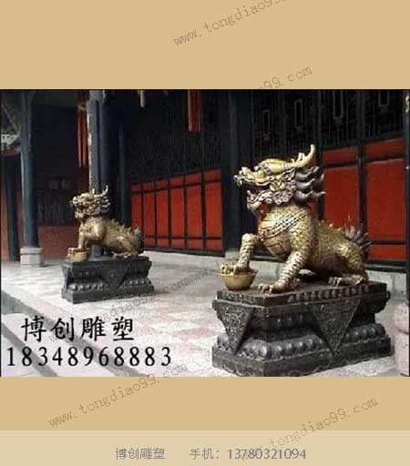 古人把雄性稱麒,雌性稱麟,《宋書》:麒麟者,仁獸也。牡曰麒,牝曰麟。麒麟是吉祥神寵,主太平、長壽;麒麟因其深厚的文化內涵,在中國傳統民俗禮儀中,被制成各種飾物和擺件用于佩戴和安置家中,有祈福和安佑的用意。博創銅雕公司提供各種麒麟銅雕等銅雕的訂做,我們制做的麒麟銅雕做工精湛。做為雕塑廠家,滿足您的需求,為您打造一流的雕塑作品是我們的使命。博創銅雕公司為您鑄造各種銅雕工藝品,歡迎聯系洽談!