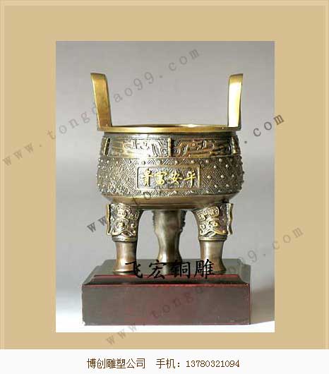 平安富貴鼎這個作品寄托了客戶對其自己以及家人的美好祝愿,有安定人心奮發向上的作用。每個廠家都可以根據客戶的需要進行不同的規格型號制作,我公司可以根據客戶的需要進行產品的加工定制。鼎的種類有很多,不僅僅是平安富貴鼎,不管客戶有怎樣的需求,相信我們都能達到您的標準。我公司有多年制作平安富貴鼎的經驗,有專業的制作團隊,相信我們,您將會得到令您滿意的結果。無論是怎樣的需求,我們都能給您一副滿意的答卷。我公司提供各種鼎的訂做,我們制做的平安富貴鼎做工精湛,做為雕塑廠家,滿足您的需求,為您打造一流的平安富貴鼎作品是我們的使命。博創銅雕公司為您鑄造各種平安富貴鼎,歡迎聯系洽談!