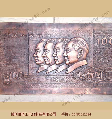 在中國錢幣博物館陳列出來的五套人民幣中,與后四套不同的是,第一套人民幣上“中國人民銀行”六個字的排列為自右向左,而1952年毛主席審閱票版時,提出人民幣行名排列應由左向右,所以自1953年起,人民幣上“中國人民銀行”的排列一律改為由左向右了。您看到的圖為博創(chuàng)銅雕公司鑄造的人民幣銅浮雕,處處體現出博創(chuàng)銅浮雕的精湛之處。我公司是多年的銅浮雕公司,對于鑄造銅浮雕有著相當豐富的經驗。