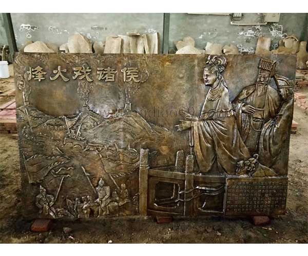銅浮雕多是故事的展示,一副銅浮雕展現的就是一個小故事,這個銅浮雕是烽火戲諸侯是一則歷史典故,指西周時周幽王,為褒姒一笑,點燃了烽火臺,戲弄了諸侯。一個故事,一段歷史都被刻畫在了這銅浮雕上。